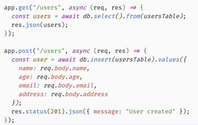 以上是安裝兩種 ORM 的差別,接下來我們來試著在 Express 上實作 API,做新增跟讀取 USER 的功能。 首先我們先看 Drizzle 的做法: