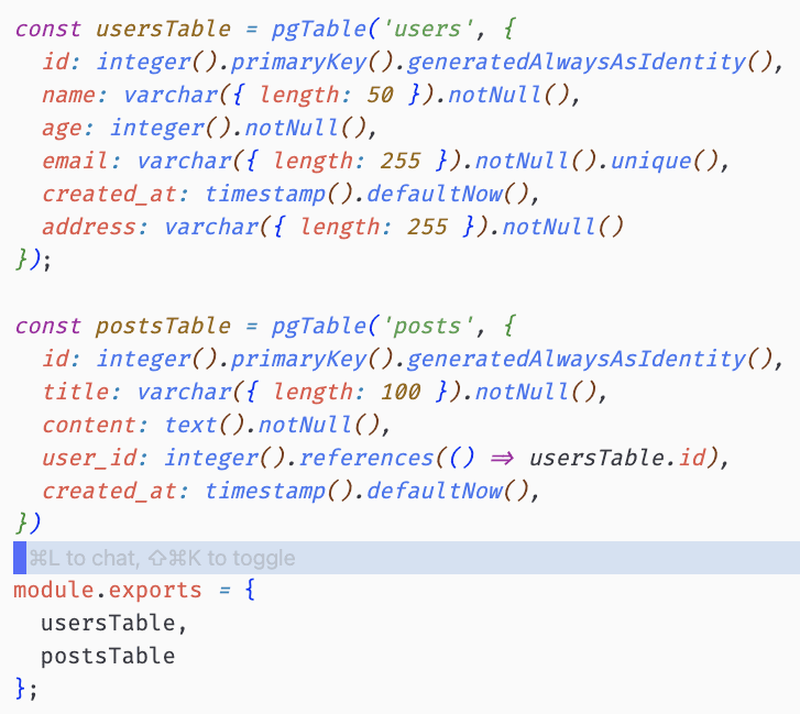 };這裡我們試著建立 users 和 posts 的資料表,如果要使用各種資料庫的型別,必須從 drizzle 裡面取得相關的 function,例如 integer,就要使用 integer()。然後要設定關聯的話,例如 posts 跟 users 有關聯,可以在 postsTable 的 user_id 設定 integer(),並使用它裡面的 `references()