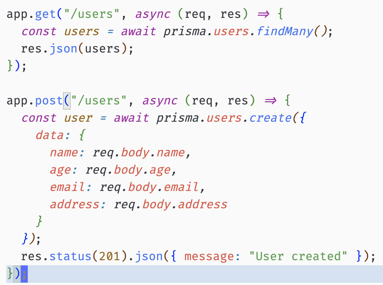 以上是安裝兩種 ORM 的差別,接下來我們來試著在 Express 上實作 API,做新增跟讀取 USER 的功能。 首先我們先看 Drizzle 的做法: